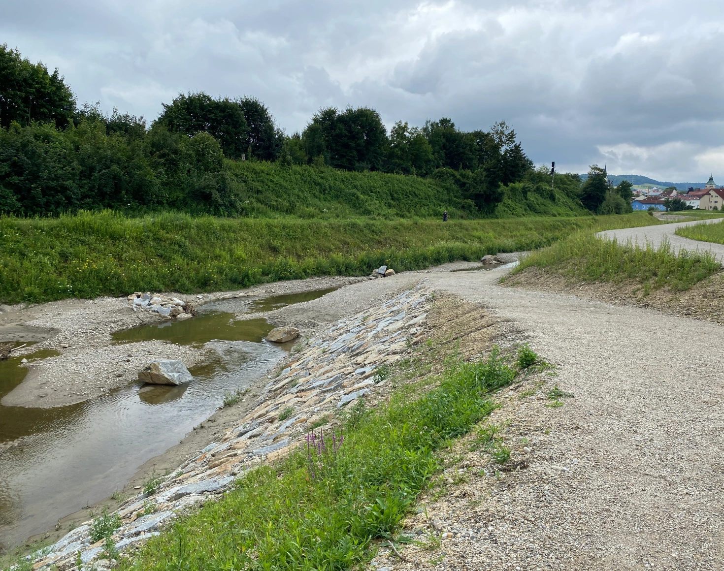 Zu Beginn des Jahres 2017 wurden etliche Öko-Maßnahmen am Standort Braunau-Simbach abgeschlossen. Die bestehende Ufersicherung wurde auf knapp 400 m Länge entfernt und ein Flachufer hergestellt. Die zu entfernenden Gehölze wurden teilweise als Rau- bzw. Strukturbäume am entstehenden Flachufer wieder eingebaut. Dadurch können kleine, nachhaltige Buchten entstehen, die in Kombination mit der Totholzstruktur wertvolle Jungfisch-Habitate bilden und prägende, naturnahe Landschaftselemente darstellen. Im Bereich des Uferrückbaus ist damit zu rechnen, dass sich das Ufer bei Hochwässern morphologisch weiterentwickeln wird und dynamische Uferzonen mit einem kontinuierlichen Übergang zwischen Au und Fluss entstehen.